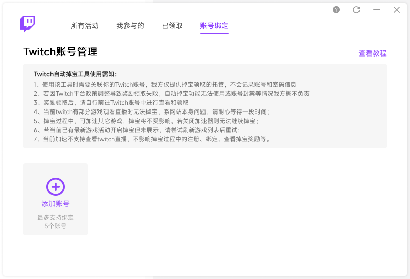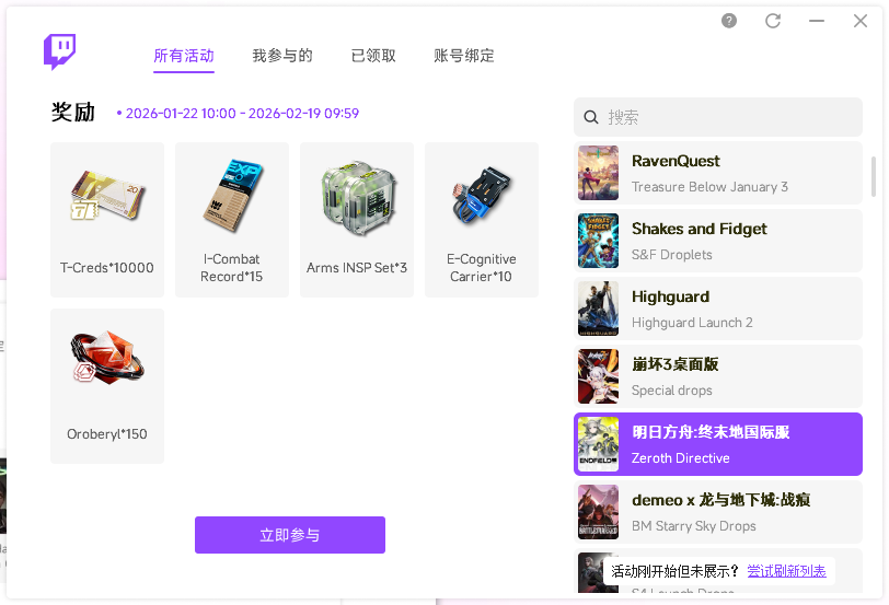 回到雷神Twitch掉宝页面,右侧选择掉宝游戏并一键参与。掉宝工具自动托管账号在线挂直播时长,完成进度自动领取奖励。